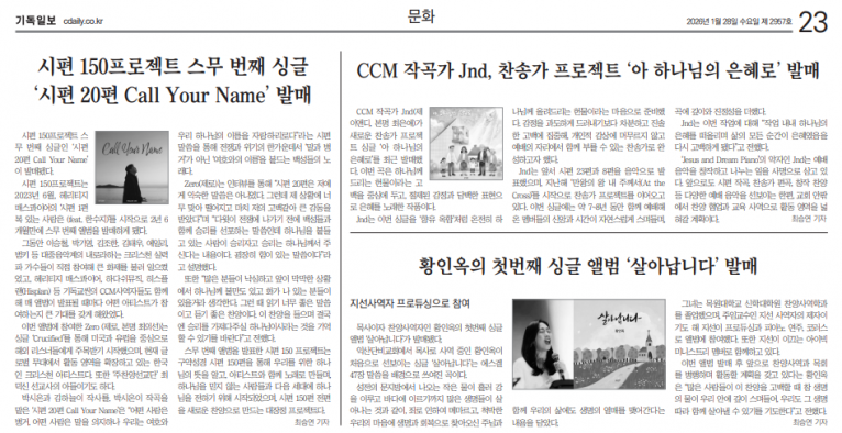 [기사] 시편 150프로젝트 스무 번째 싱글 ‘시편 20편 Call Your Name’ 발매(기독일보)