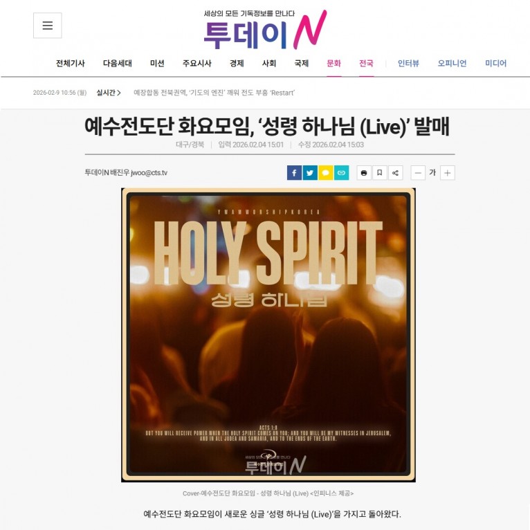 [기사] 예수전도단 화요모임, ‘성령 하나님 (Live)’ 발매(투데이N 기독교텔레비전)