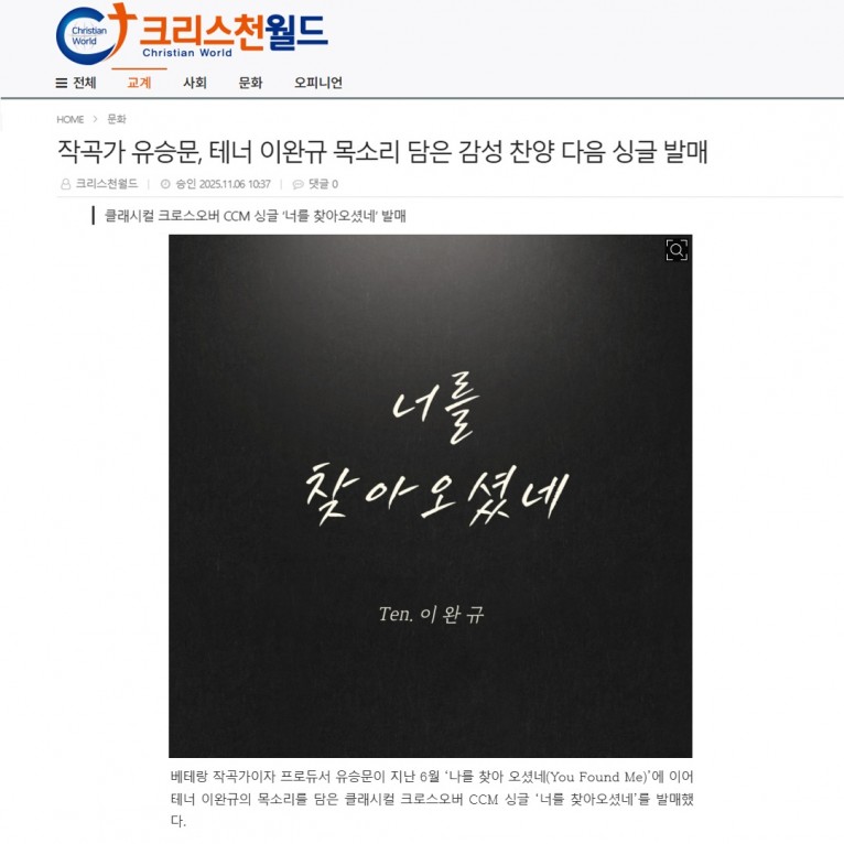 [기사] 작곡가 유승문, 테너 이완규 목소리 담은 감성 찬양 다음 싱글 발매(크리스천월드)