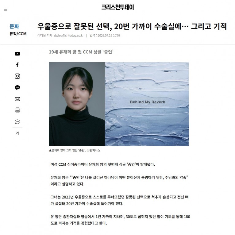 [기사] 우울증으로 잘못된 선택, 20번 가까이 수술실에… 그리고 기적, 19세 유채희 양 첫 CCM 싱글 ‘증언’(크리스천투데이)